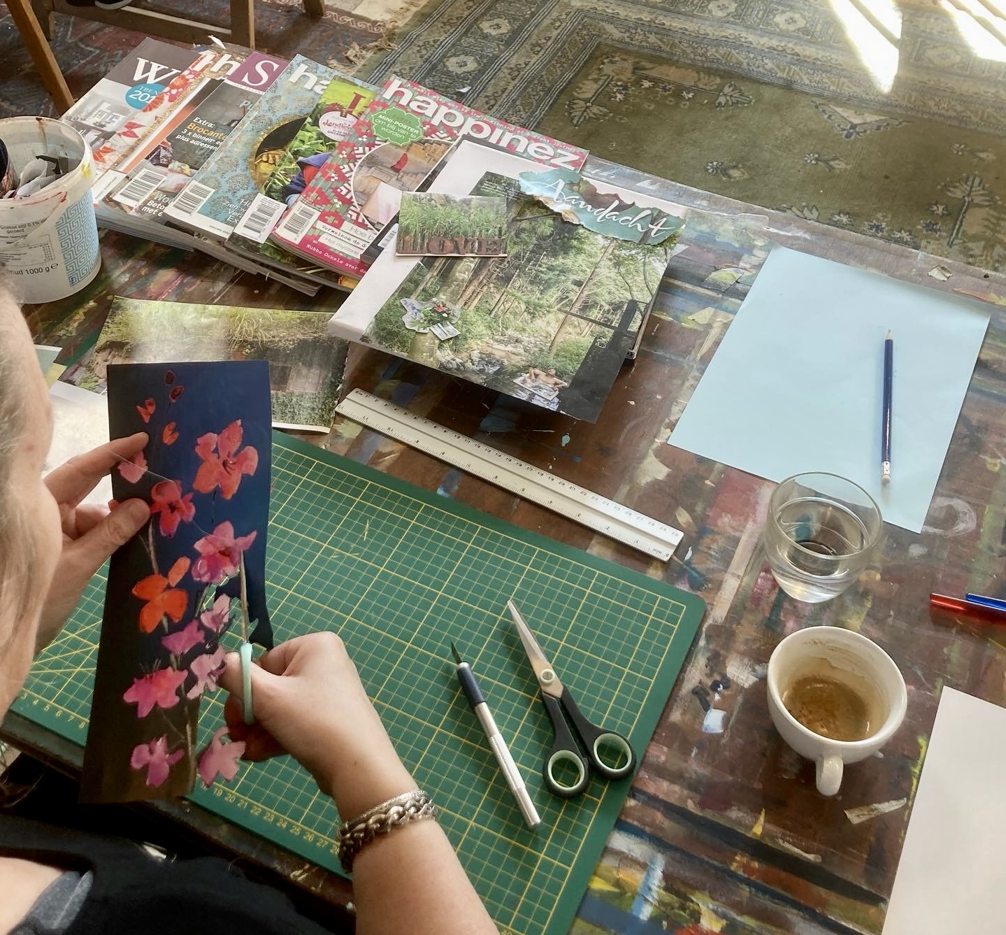 Na een warm welkom kregen we een duidelijke uitleg met voorbeelden van hoe we een collage konden maken op een canvas bord, kaarten of een huisje. Al bladerend, knippend en scheurend in tijdschriften ontstonden er prachtige kunstwerken. Marlies gaf daarbij goede raad.